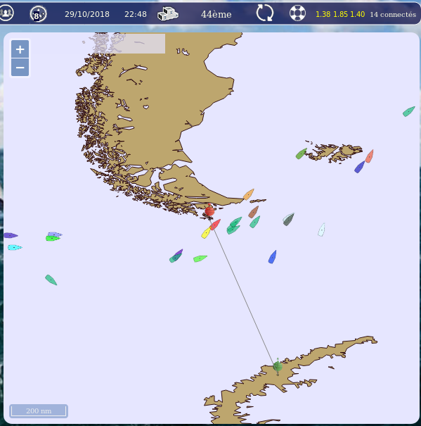Devant, dans le groupe des 4 (ernol Danfers, Stakk GD, Dani1290 FV-R et Hello Boy), c'est chaud bouillant, les écarts se resserrent, moins d'un degré de différence de latitude, l'équateur est en vue et il va falloir négocier au mieux la dernière ligne droite (ou pas droite) pour remonter l'Atlantique nord. Pas de miracle, un des 4 sera chocolat, mais le classement final est loin d'être établi. Un très grand bravo à cette bande des 4 qui tire la course vers le haut :!: